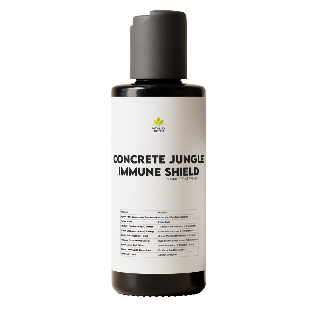 Armor your body against the urban grind. Concrete Jungle Immune Shield is a powerful daily elixir formulated to defend your vitality where city life is toughest. This potent blend of Elderberry, Vitamin C, Zinc, and Echinacea creates a robust barrier against environmental stressors and seasonal challenges. With a base of antioxidant-rich pomegranate juice, it’s a tart, vibrant tonic that might turns daily defense into a simple, effective ritual. Your daily dose of resilience for the concrete jungle.
